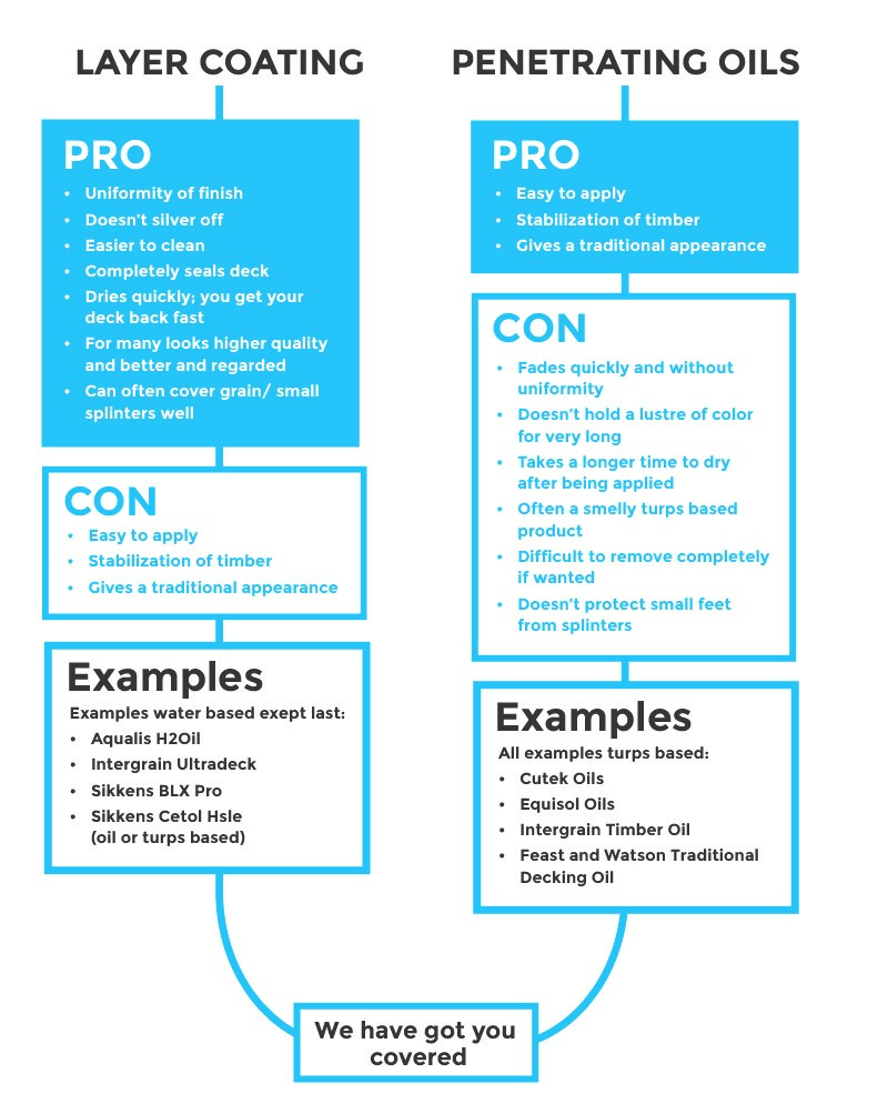 With much mis-information within hardware stores and property maintenance groups, we have become educators over time, in order to put our customer base back on firm ground when it comes to deck oiling. When it comes to what you want to spend your money on, it’s good to keep it really simple. Either you want a layer coating or a penetrating oil when oiling your deck. The benefits of layer coatings are their ability to look uniform and often they are easier to wash and maintain – but left for too long will always require a sanding back to restore in full. Penetrating oils, whilst seemingly easier to apply and giving a more traditional decking appearance, tend to always grey-off prematurely and cause hassles when it comes to cleaning, maintaining uniformity and prepping before re-oiling. Generally, it’s going to be cheaper to go with what’s been used previously (unless it needs stripping of course), but we advise you on which product to choose according to the above criteria and the look and feel wanted by your decking oil.